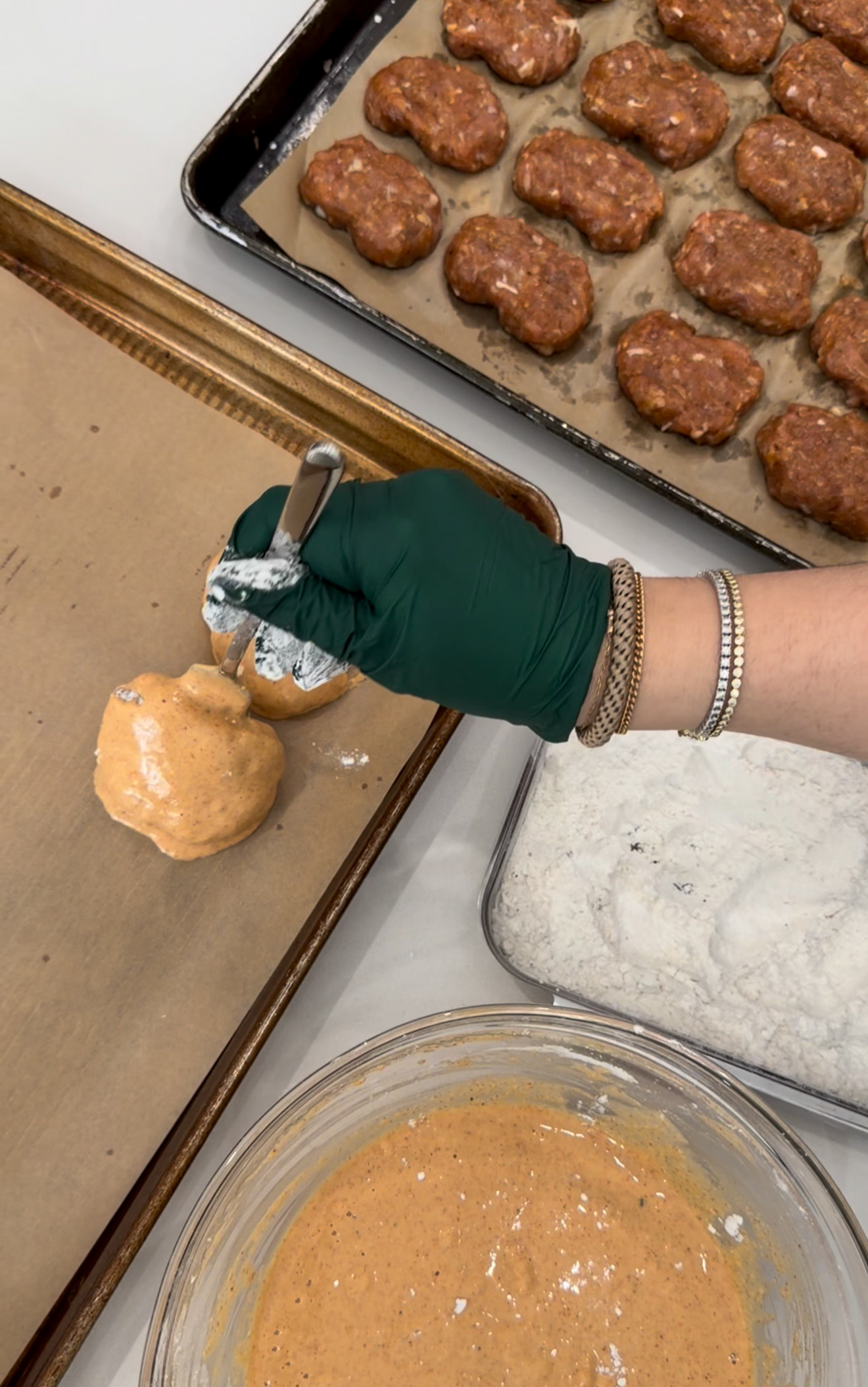 Coat the chilled nuggets in the dry mixture, then dip into the wet batter, letting excess drip off.