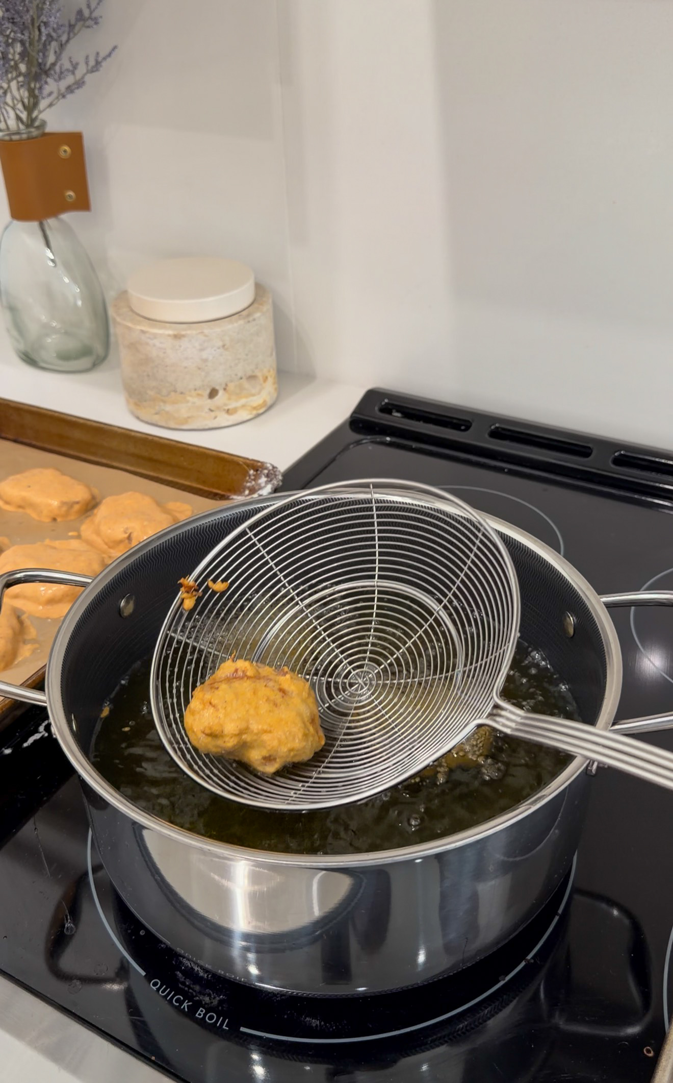You can try, but they won’t be quite as airy and crisp as deep frying. If air frying, spray generously with oil and cook at 400°F until golden and cooked through.