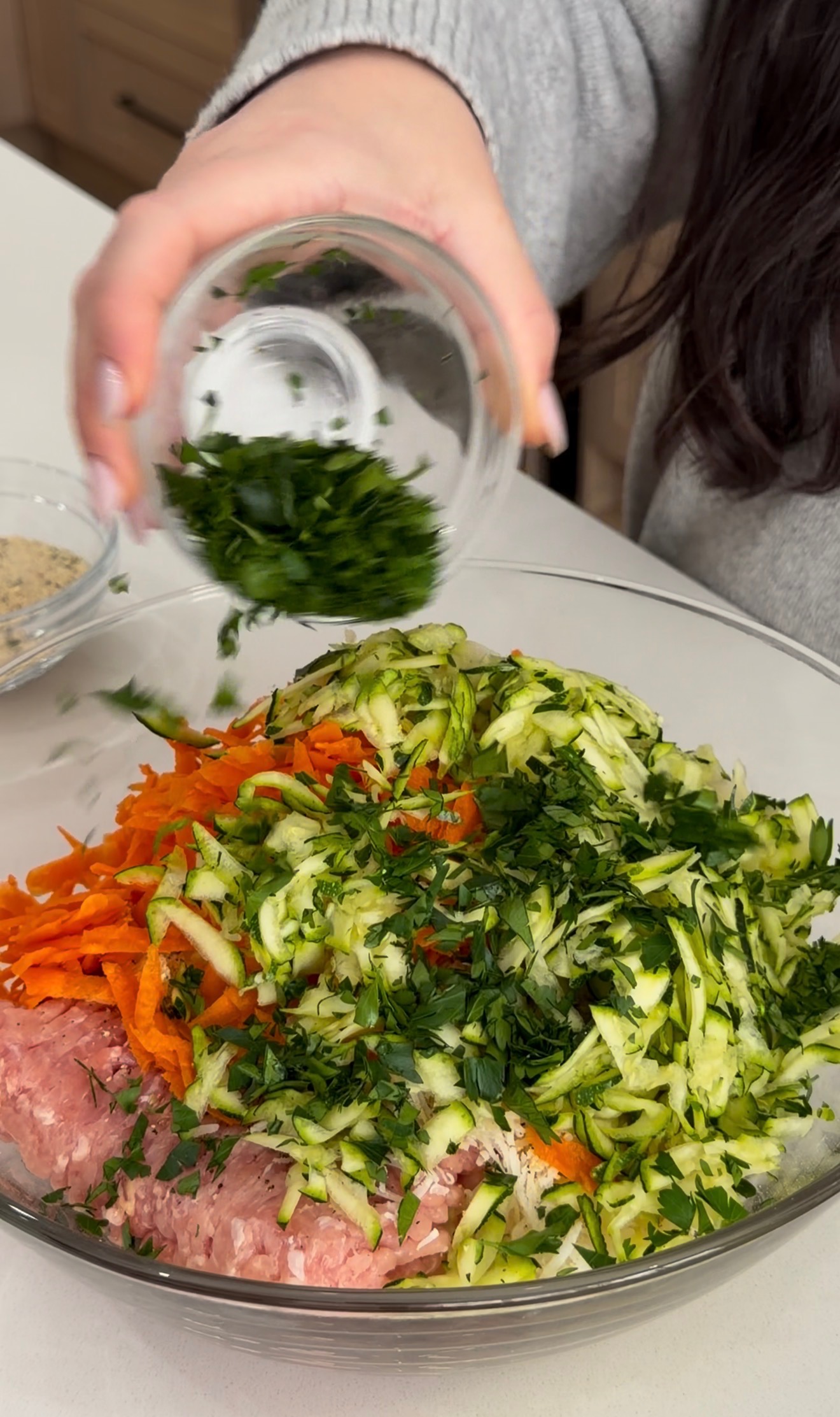 In a large bowl, combine the grated zucchini (with excess moisture squeezed out), grated carrot, ground chicken, garlic, onion powder, garlic powder, oregano, breadcrumbs, egg, Parmesan, parsley, salt, and pepper. Mix until just combined, being careful not to overwork the mixture. Form into evenly sized meatballs.