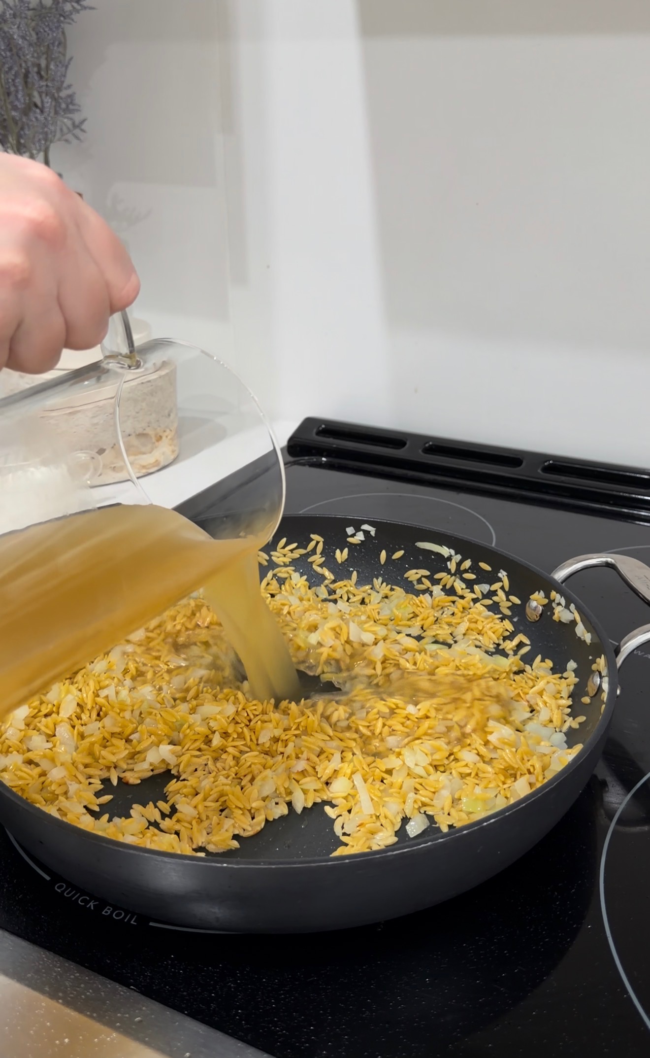 Meanwhile, in the same skillet, heat the butter and olive oil over medium heat. Add the onion and cook until softened, about 3โ4 minutes. Stir in the garlic and cook for another 30 seconds, until fragrant. Add the orzo and toast for 1โ2 minutes, stirring frequently.
