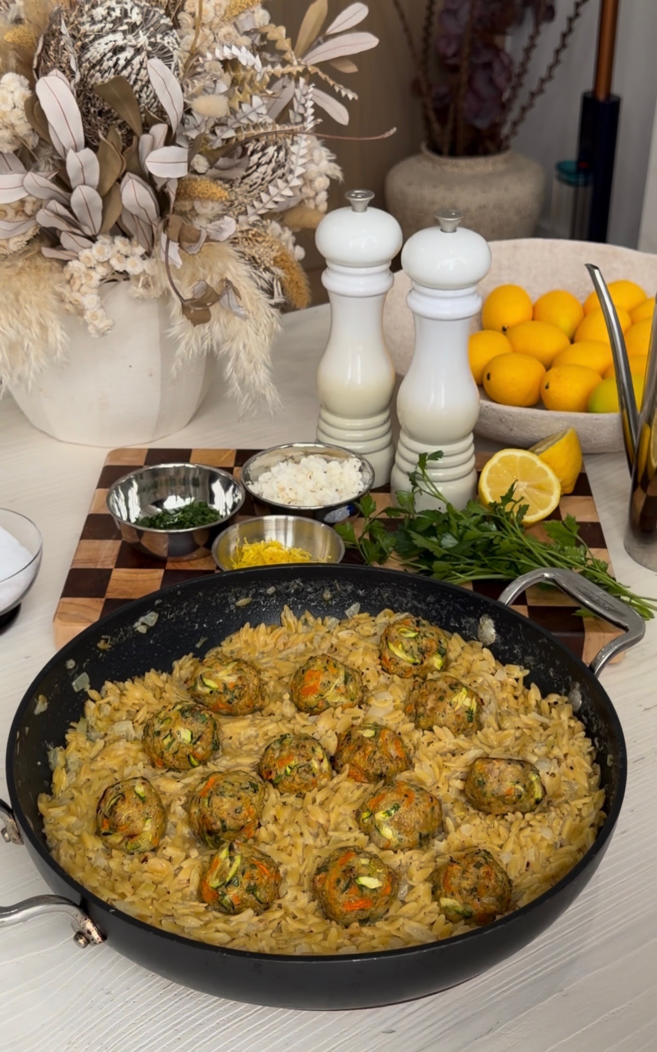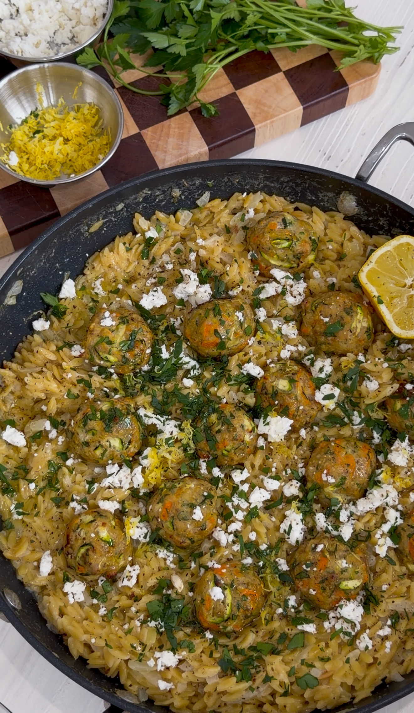 Nestle the meatballs into the orzo, cover, and cook on low heat for 10 minutes to allow the flavors to come together. Finish with crumbled feta, extra lemon juice and zest, fresh parsley, and a final pinch of salt and pepper before serving.
