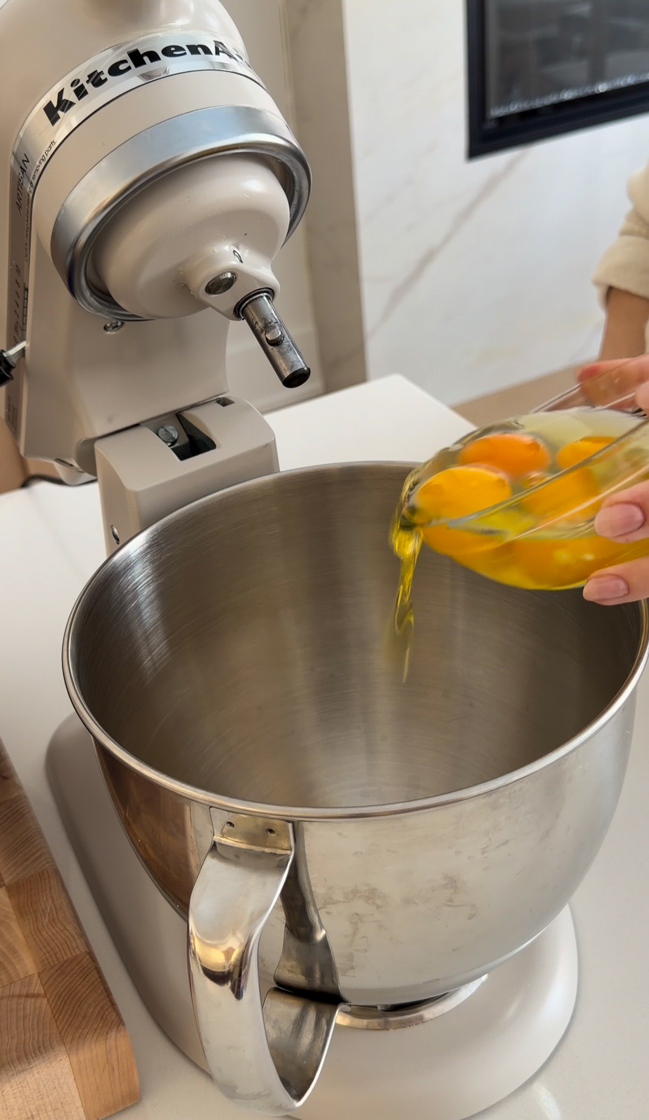 Melt butter and let cool. Beat eggs and sugar in a mixer until very thick and pale (about 5–10 minutes).