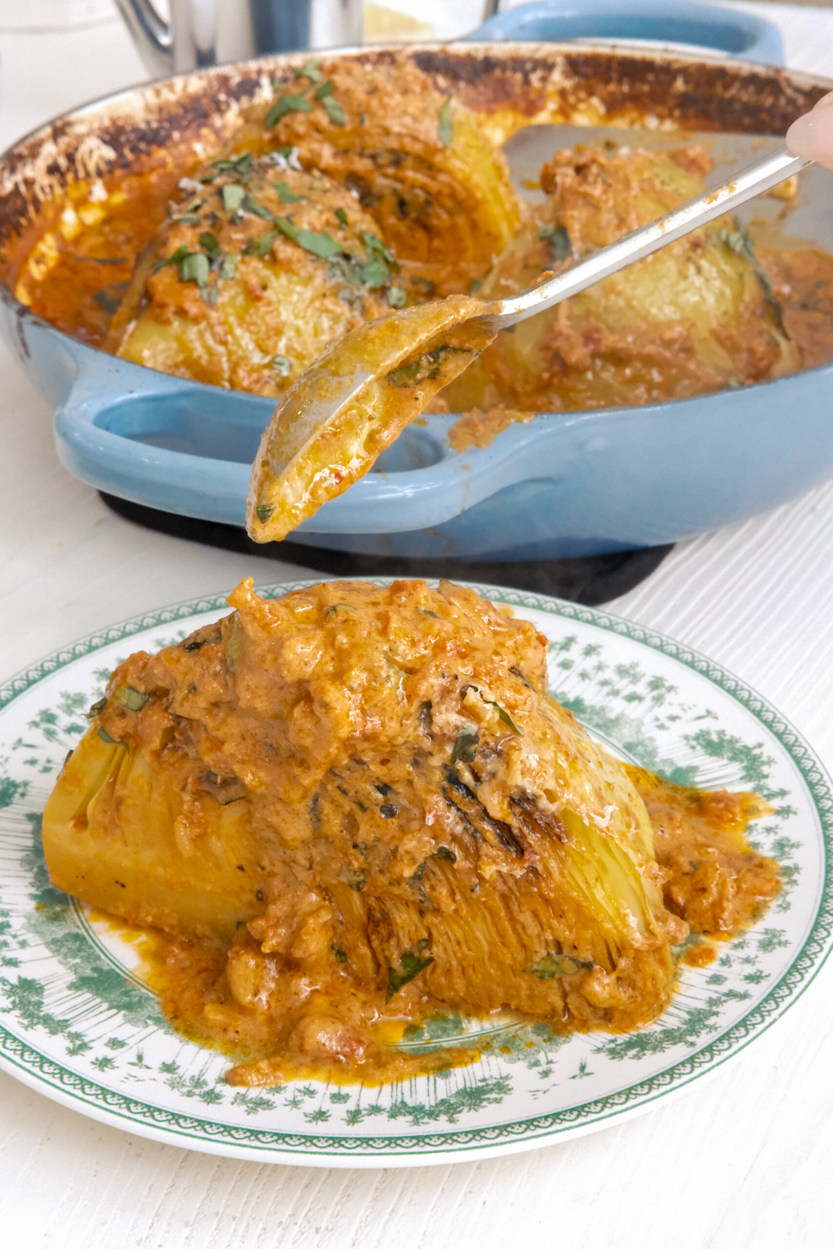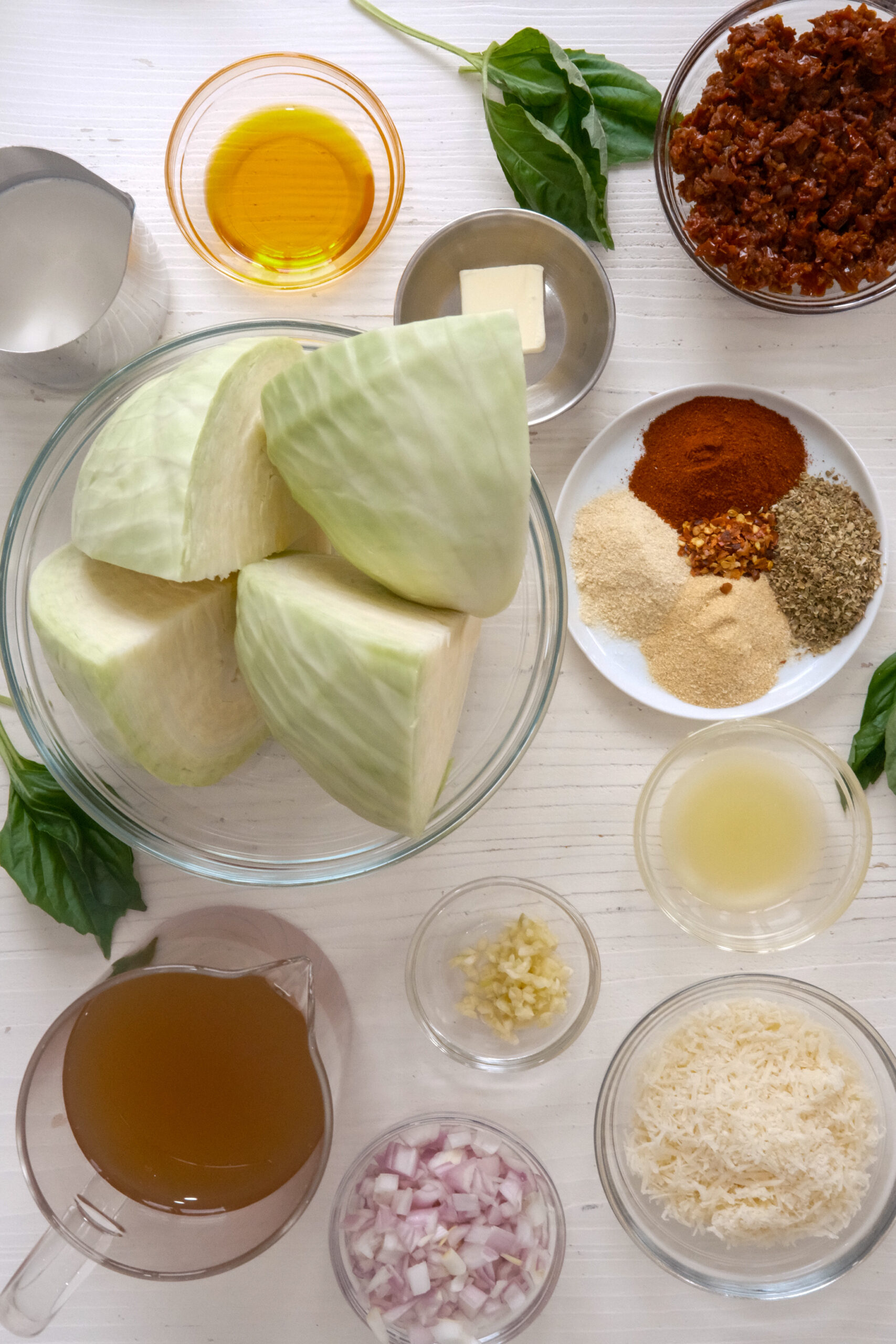 It all starts with the sear. Getting deep golden color on the cabbage wedges before they go into the oven builds a layer of flavor that carries through the entire dish. The sauce does the heavy lifting from there โ tomato paste, sun-dried tomatoes, and sun-dried tomato oil bring a concentrated, almost jammy richness, while cream smooths everything out into something velvety and indulgent. The spice blend gives it warmth and depth without overwhelming the other flavors. Then the cabbage braises low and slow until it’s completely tender and melting into that sauce. Finished with Parmesan and fresh basil, every bite is creamy, savory, and just a little bit smoky.