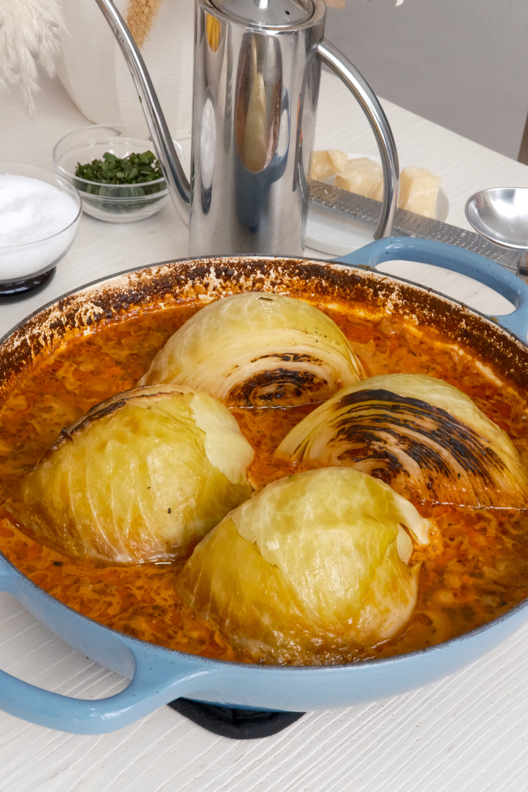 Return the seared cabbage wedges to the pot, nestling them into the sauce. Spoon some of the sauce over the top. Cover and transfer to the oven. Bake for 45 minutes covered, then uncover and bake for another 15 minutes until the cabbage is tender and the sauce has thickened slightly.