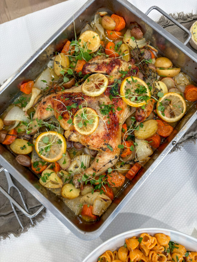 This One Pan Herby Lemon Roasted Chicken with Veggies is just comfort food at its absolute finest. A whole chicken gets seasoned simply (but well seasoned!), is tucked over a bed of vegetables, and roasted until the skin is golden and the pan juices are rich with lemon and herbs. The herby compound butter melts slowly under the skin, basting the meat from the inside out, while the vegetables soak up everything happening in the pan. Itโs straightforward, unfussy cooking that will still blow your mind.