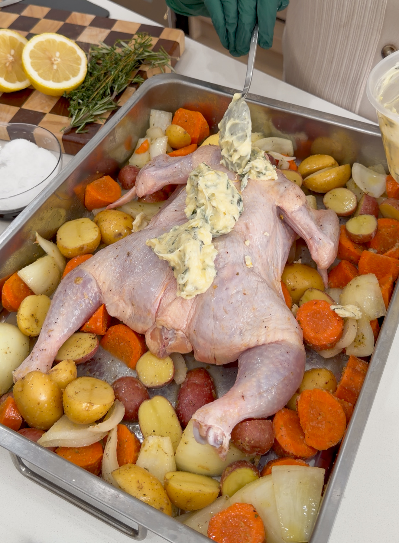 Next, spread the vegetables evenly in a large roasting pan. Place the chicken directly on top of the veggies. Gently loosen the skin over the chicken breasts and thighs and spread about half of the compound butter underneath the skin. Rub the remaining butter all over the outside of the chicken. Dollop any extra butter over the vegetables.