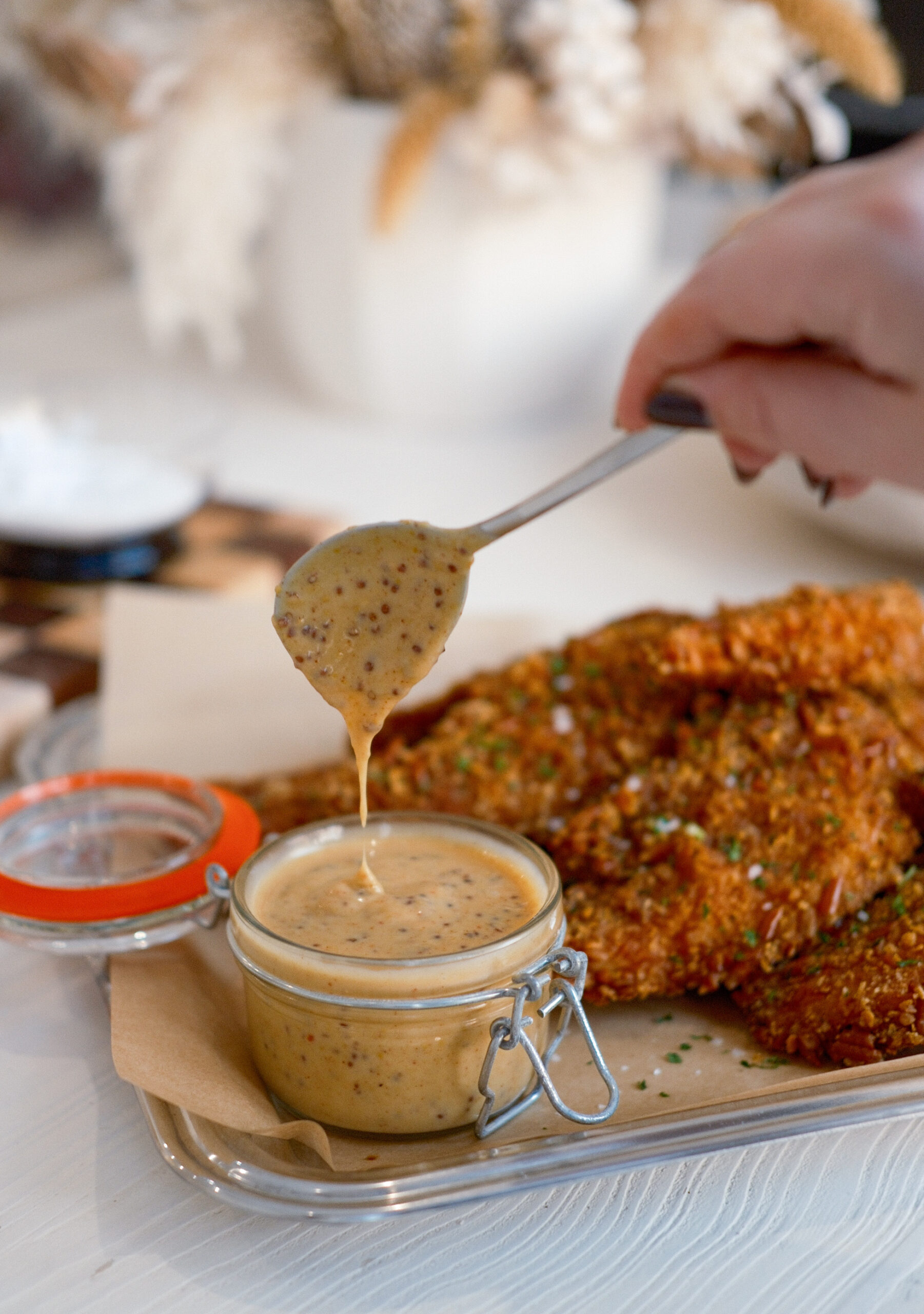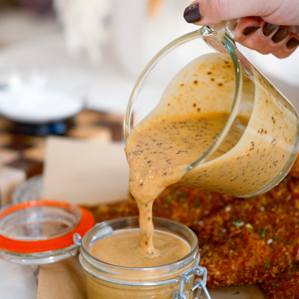 Store leftover chicken tenders in an airtight container in the fridge for up to 3 days. Reheat in a 400ยฐF oven or air fryer until hot and crisp. Avoid the microwave if you want to keep that crunch. The sauce keeps well in the fridge for up to 5 daysโjust stir before serving.