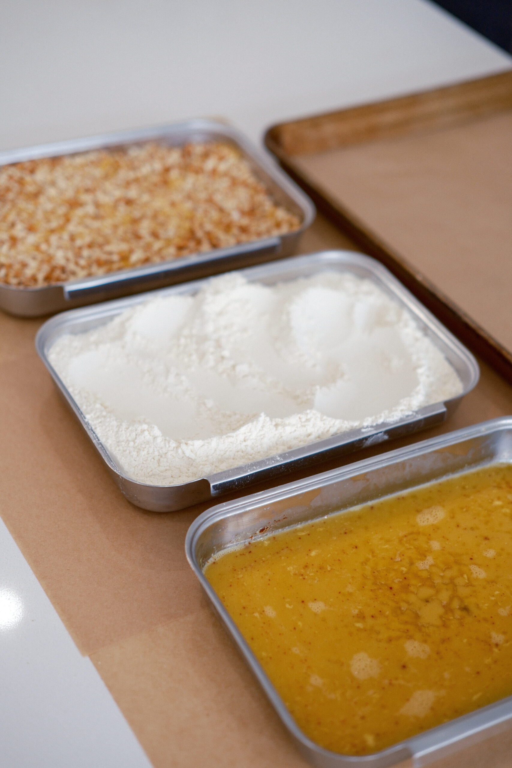 Set up a dredging station with three shallow bowls: one with flour, one with beaten eggs, and one with the pretzel and cornflake crumbs. Season each bowl with salt and pepper. Add paprika and a small dash of Dijon mustard to the eggs, whisking until smooth.