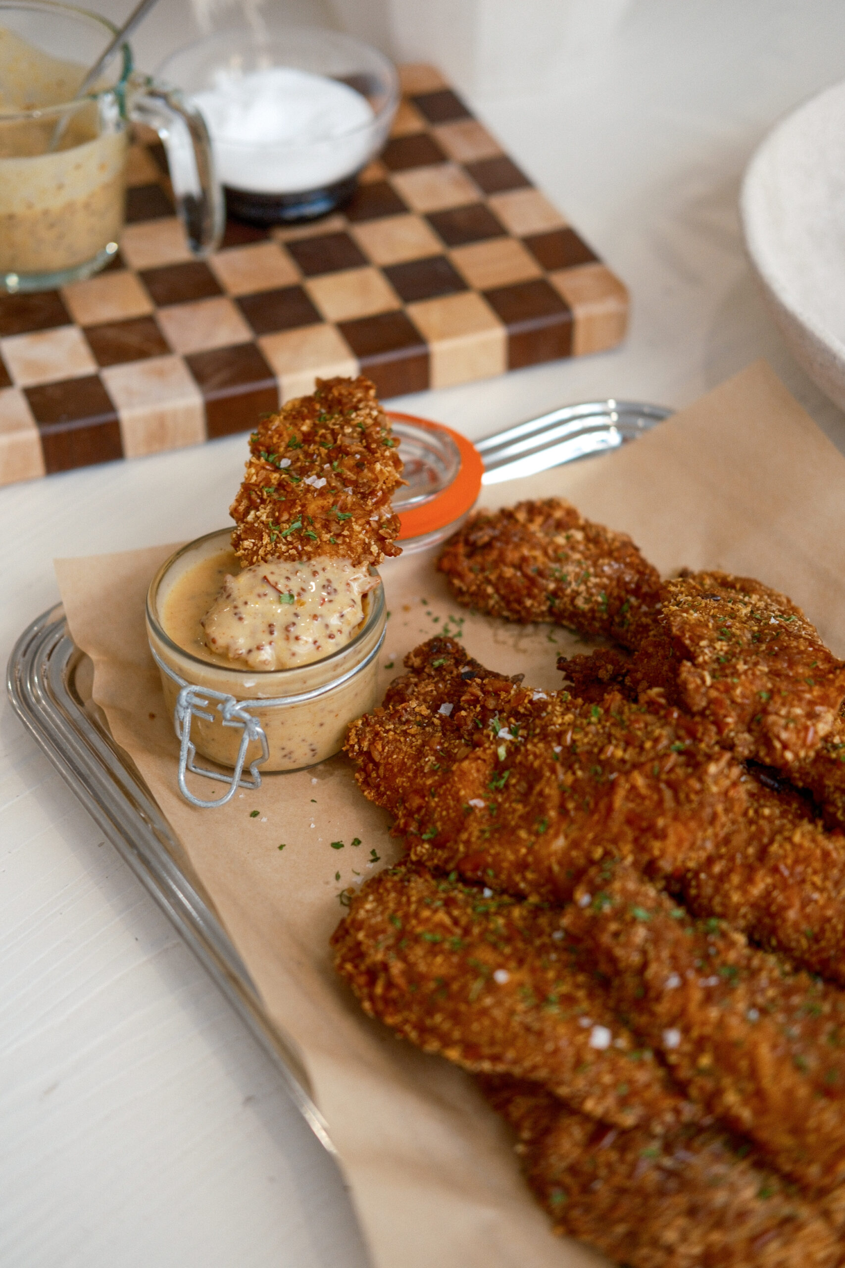 These chicken tenders hit that sweet spot between nostalgic and next-level. The pickle juice marinade keeps the chicken tender and juicy all the way through, while the pretzel-cornflake coating fries up crisp with just the right balance of salty crunch. Finishing them in the oven locks in that golden crust without drying out the meat. And then thereโs the hot honey mustard sauce. This is comfort food with texture, flavor, and zero boredom.