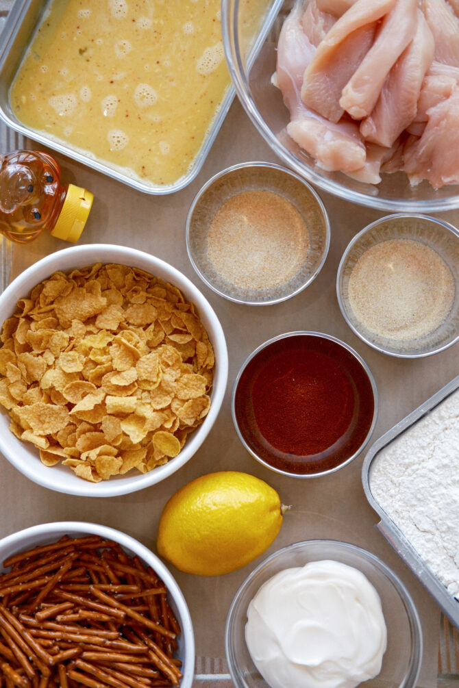 RECIPES These Pretzel-Cornflake Chicken Tenders with Hot Honey Mustard Sauce are not your average chicken tenders. The pretzel crumbs bring that salty snap, the cornflakes add extra crunch without heaviness, and the pickle-juice marinade keeps the chicken insanely juicy inside. Frying first gives you that golden, crispy coating, while the quick oven finish ensures the chicken